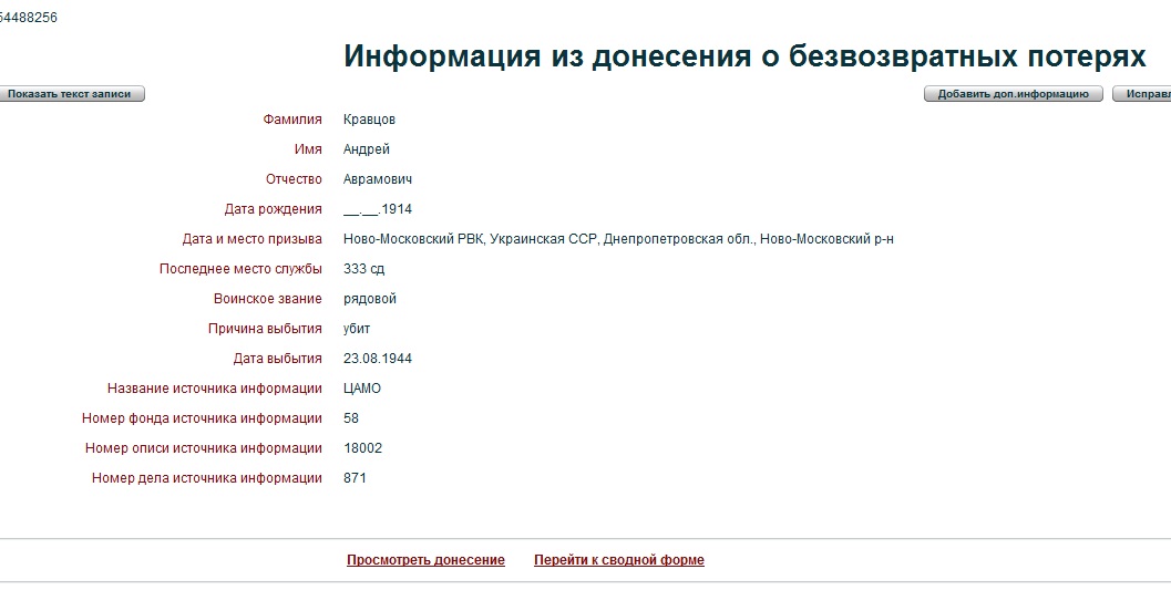 человеке: отчество, дату рождения и воинское звание, место рождения, место призыва на воинскую службу и т.д.