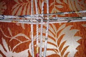 Когда трубочки готовы и высохли, возьмите 16 штук и расположите их крест накрест так, чтобы каждая трубочка переплетала следующую. После выберите одну трубочку подлиннее, она будет рабочей, вставьте ее в основание, согните пополам и плетите по технике "веревочка". Плетите до тех пор, пока рабочая трубочка не закончится, после вставьте в конец рабочей трубочки новую трубочку, предварительно смазав ее клеем, и продолжаете плести до верха.
