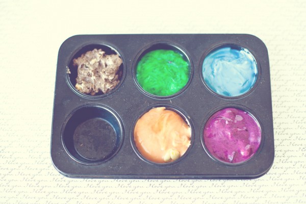 В небольшую кастрюлю положите немного зубной пасты, добавьте массу из миксера и 1/4 стакана воды. Перемешивайте всё, пока краска не загустеет.