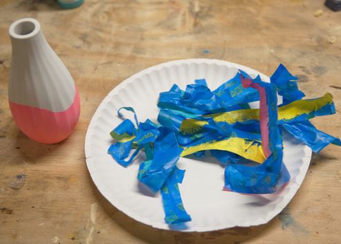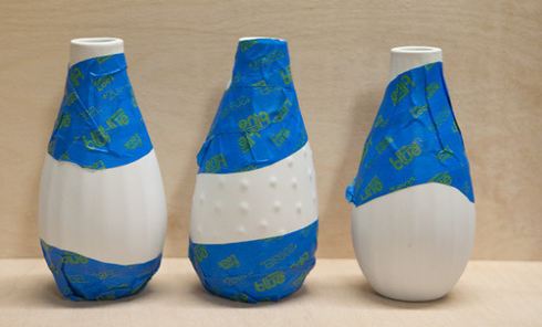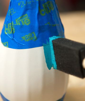 После того, как основной слой краски высох, возьмите в руки скотч. Закройте на вазе только те места, где останется базовый слой краски. Фантазируйте при наклеивании скотча, так вы сможете создать необычный орнамент.