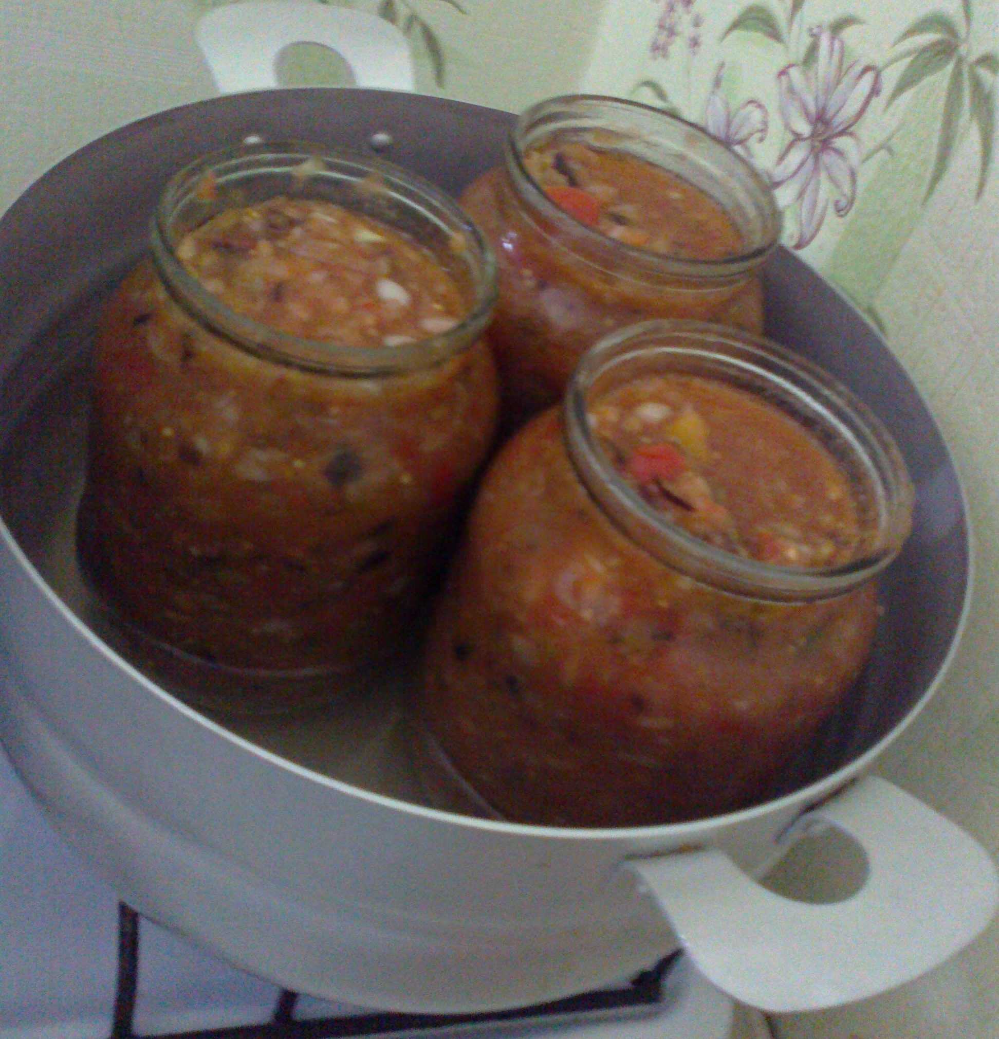 Тушеные овощи разложите в горячем виде по предварительно стерилизованным банкам. Банки с овощами поставьте в кипящую воду и простерилизуйте. Литровые банки стерилизуйте в течение тридцати-сорока минут, а пол-литровые – двадцать пять минут.
