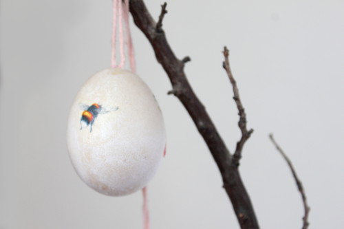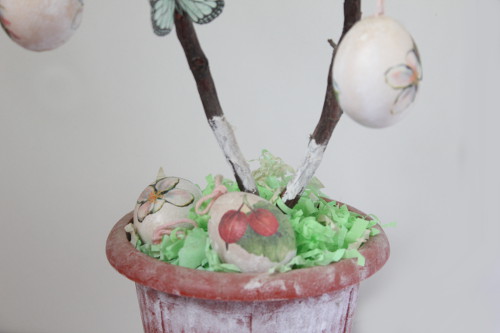 Развесить на веточки деревца декоративные яйца из пустых яичных скорлупок. Такие яйца можно украсить рисунками,