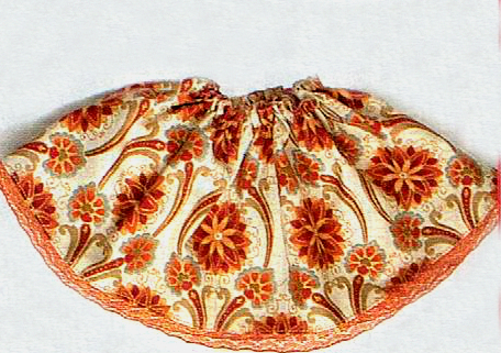 Обработайте низ швом «зигзаг», заутюжив, пришейте кружево. Сверните пополам ткань, выполните задний шов. Присоберите верх юбки до размера лифа швом «вперед иголку».