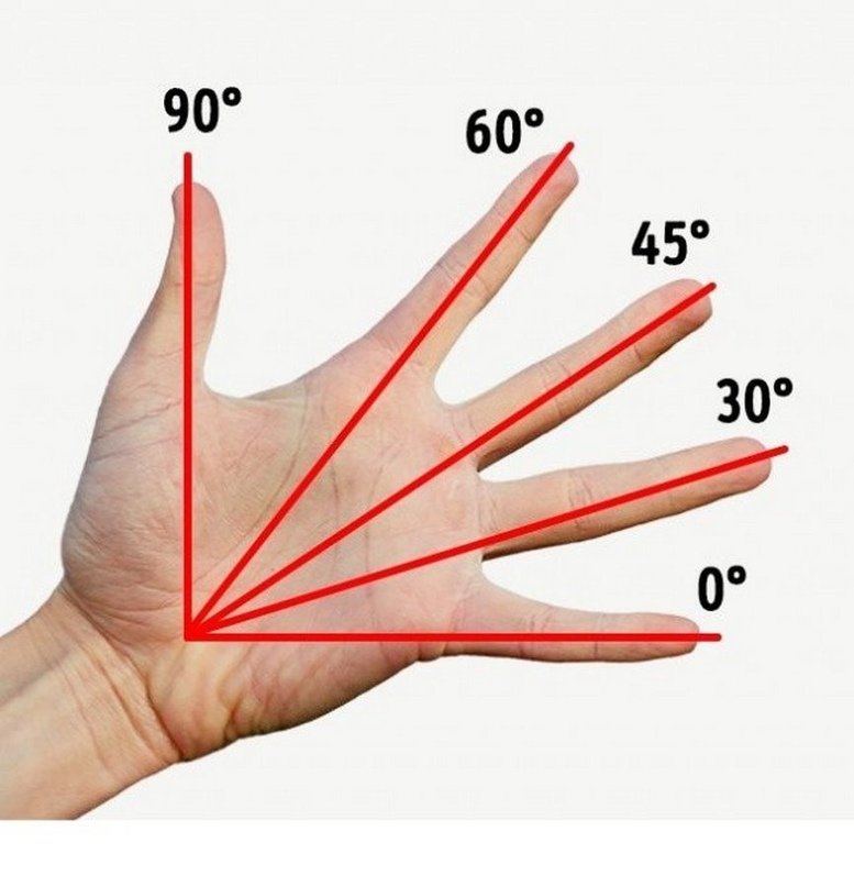 Транспортиром можно определить размер углов максимально точно. Существуют и другие приспособления для проведения измерений. Если рядом нет ни одного из них, можно использовать руки. Для этого необходимо максимально расставить пальцы и приложить к поверхности, на которой нужно измерить угол. Мизинец должен лежать на нижней плоскости. Он условно обозначает 0°. Угол между большим пальцем и мизинцем будет равен 90°, а углы между мизинцем и другими пальцами составляют, соответственно, 30°, 45° и 60°.