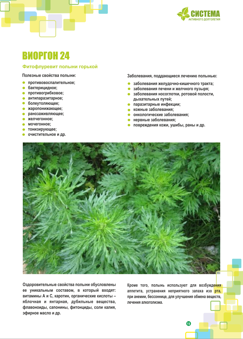 Фитотерапия с помощью этого растения позволяет избавиться от любой инфекции, глистной инвазии, воспаления, нормализовать обмен веществ. Горечь, присутствующая в листьях, стеблях и корнях полыни горькой, стимулируют рефлекторную деятельность желудка и кишечника, улучшает пищеварение и способствует выводу мочи. Используется полынь для лечения простуд, кашля, алкоголизма, изгнания глистов. Виорогны из полыни это настои лишонные вкуса, запаха и побочных эффектов. ц 750р курс на месяц 400 капель