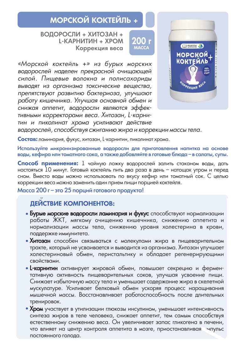 «Морской коктейль +» из бурых морских водорослей наделен прекрасной очищающей силой. Пищевые волокна и полисахариды выводят из организма токсические вещества, препятствуют развитию бактериоза, улучшают работу кишечника. Улучшая основной обмен и снижая аппетит, водоросли являются эффективными корректорами веса. Хитозан, L- карнитин и пиколинат хрома усиливают действие водорослей, способствуя сжиганию жира и коррекции массы тела.
