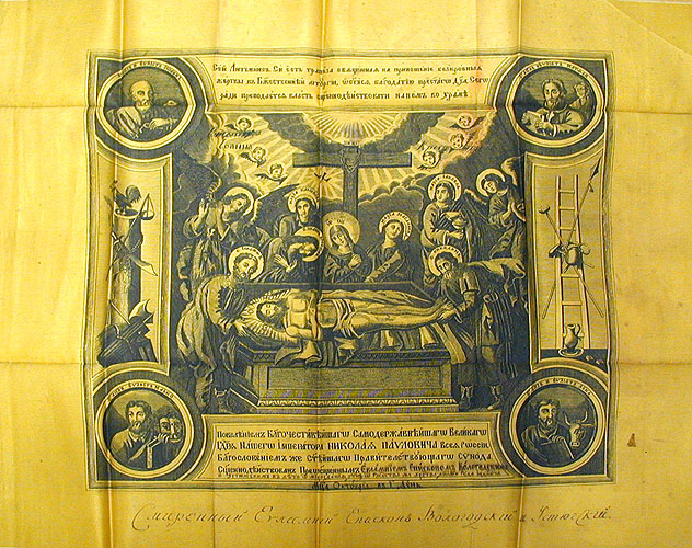 Святой антиминс. Находится на престоле. Без этого плата невозможно совершение божественной литургии в православном храме.