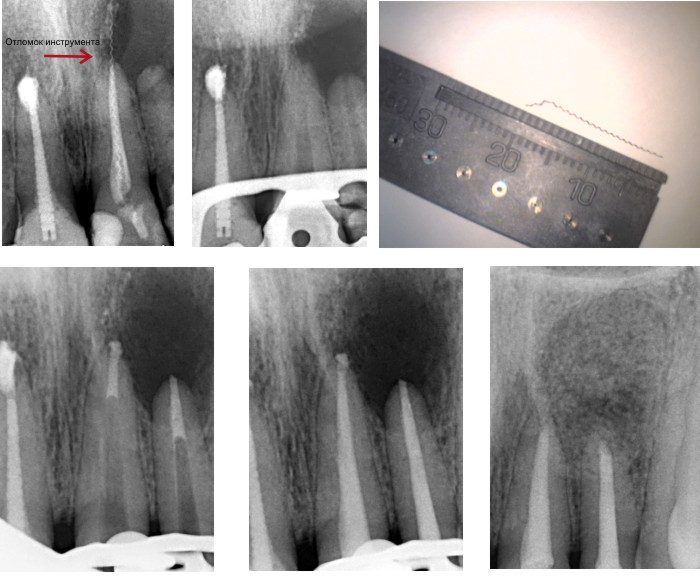 Пациент испытывал боль в области передних верхних зубов и до того, как обратиться к нам, посетил несколько клиник, где ему констатировали большую кисту в области двух передних верхних зубов и рекомендовали эти два зуба удалить вместе с кистой. Мы диагностировали наличие отломка инструмента в канале зуба, уходящего за верхушку корня и большую кисту в области двух верхних передних зубов. С помощью микроскопа был извлечен отломок инструмента и вылечены каналы без удаления зубов.