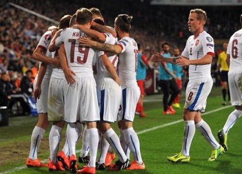 Сборная Чехии празднует гол в ворота Казахстана (общий счет 4 - 2 в пользу чехов)